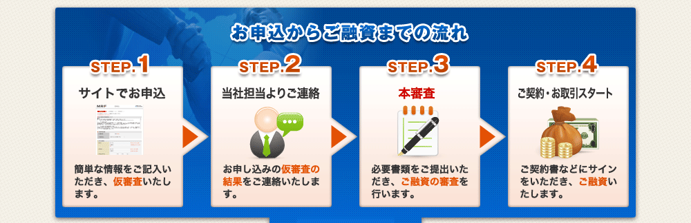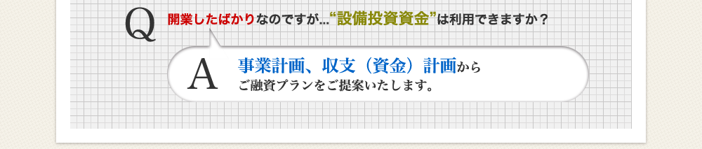 | ■必要書類(申込時) | ○運転免許証、健康保険証等ご本人を証明するもの2点 ○不動産登記簿謄本 ○公的な営業許可証又は届出書 ○事業実績を証する書類[決算書・青色申告書・確定申告書・納税証明書、資金繰り計画等の書類など] ○残高証明書(または返済予定表と引落通帳) |