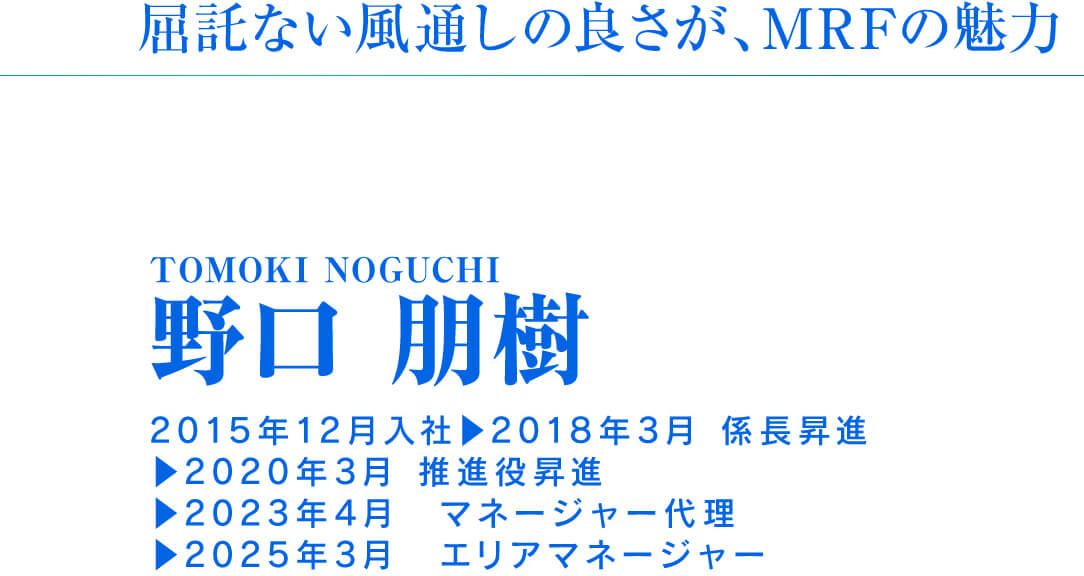 金融の仕事は幅広い知識を得られると思い検討していました。MRFにした決め手は、福利厚生などの条件面です。