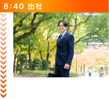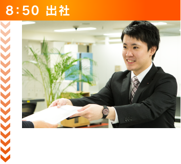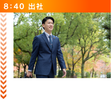 毎日8時40分に出社しています。出社してからは私自身の1日の行動予定や目標を定めます。その後、10分間程社内掃除を行います。掃除の後に事業部で前日の振り返りや1日の行動予定、目標を全員で確認し業務に取り組みます。