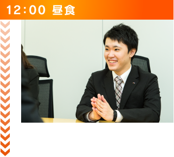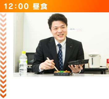 昼食は休憩室で弁当を食べたり、近くの定食屋で食べたりと、様々です。時には外出先近辺の美味しいお店で食べることができるのも営業ならではの醍醐味です。 休憩室で昼食をとる時は、普段なかなか交流の取れない他の部署の人たちとも交流が図れ、色んなアドバイスを頂けます。