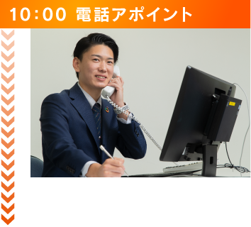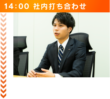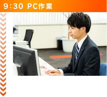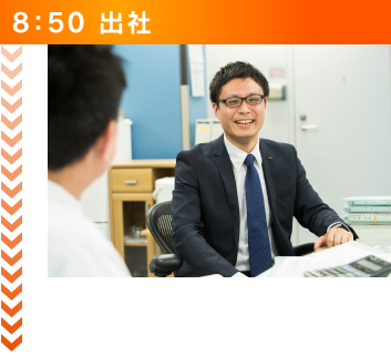 出社するとまず、1日の行動予定と目標を設定します。また先輩社員と前日の案件の見直しであったり、営業のロープレを行ったりします。