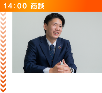 午前中や前日に約束をしたお客様との商談を行います。商談といっても一筋縄ではいきません。なので、私は商談前にお客様が当社に相談をされた背景やどう提案すれば当社の融資でお客様のお役にたてるのかを上司のアドバイスを頂いきながら考えて、お客様にマッチした最適な提案をするように心掛けています。