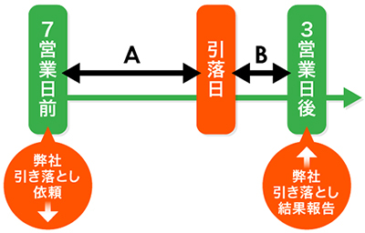 • 「引落し依頼」から「引落し日」までの間(下記A)に、店頭窓口、銀行振込みなどでご返済された場合でも、 引落しは中止されません。尚、完済時の超過分についてご契約者様へご返却いたします。