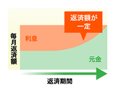 毎月の返済額(元金と利息の合計額)が初回返済から最終返済まで均一である返済方式です。毎月の返済額は同額となります。