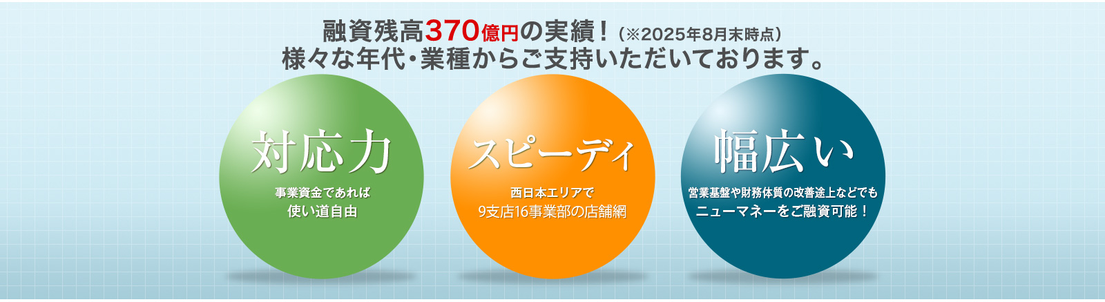TVCM、WebCMも放映しております。多くの中小企業・個人事業主様のご活躍・ご発展を融資にて応援致します。